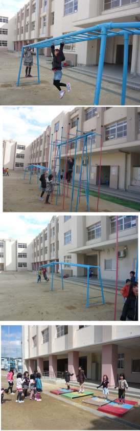 今週月曜日から移動した雲梯(うんてい)とのぼり棒が使えるようになりました。ジャングルジムの横に移動して、使いやすくなりました。また、縄跳びが人気で、跳び板には休み時間には列ができるほどたくさんの子どもたちで跳んでいます。