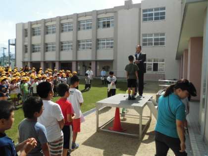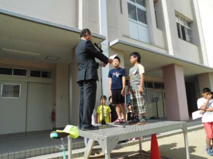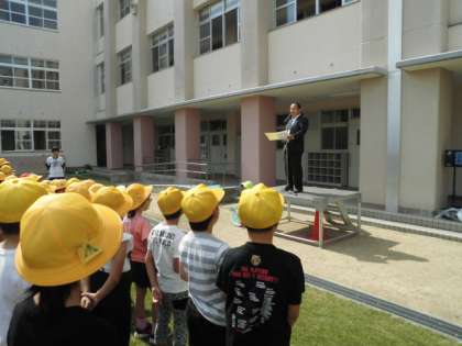 今朝は、久しぶりに芝生で児童朝会を行いました。