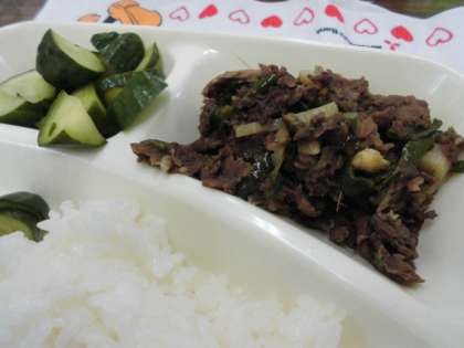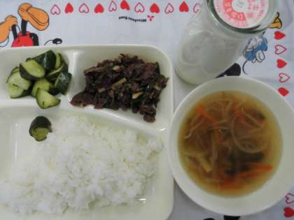献立は、チンジャオニューロウスー、ハムと野菜の中華スープ、きゅうりの辛みづけ、ごはん、牛乳でした。