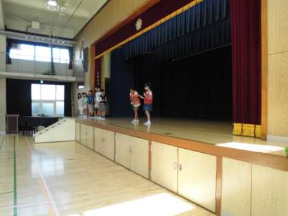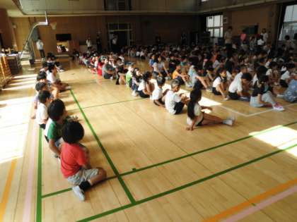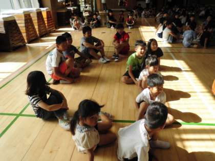 三択クイズで1の答えを選んだら、班全員が円になって座る。2を選んだら、班全員が一直線になって座る。3を選んだら、前の人の肩に手を置いて、一直線に並んで立つというように班全員で協力して答えるように工夫されていました。