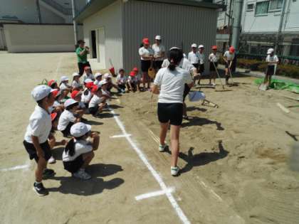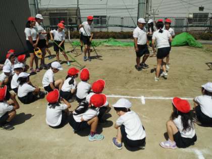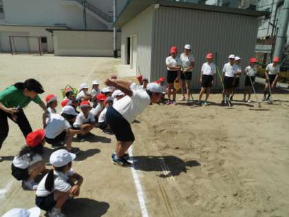 1年生のスポーツテストに6年生が補助として活躍しています。