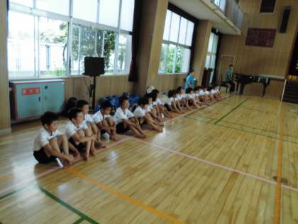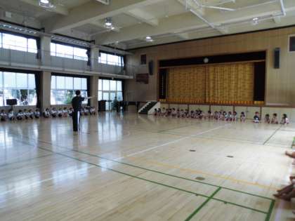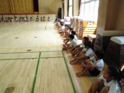 東桃谷幼児の園(きりん組 5歳児)と1年生のリズム交流を本校講堂にて行いました。