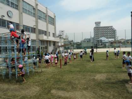 リズム交流が終わって、今度は芝生で自由に交流しました。