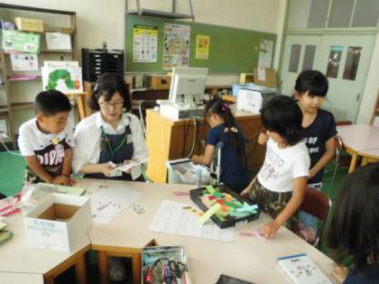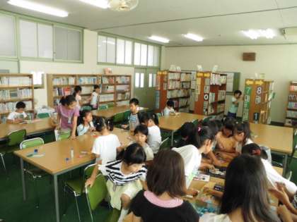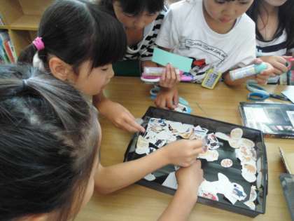 図書館補助員の昌山先生が準備してくださった様々なしおり用のかざりを工夫して、思い思いに素敵なしおりを作っています。