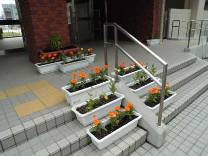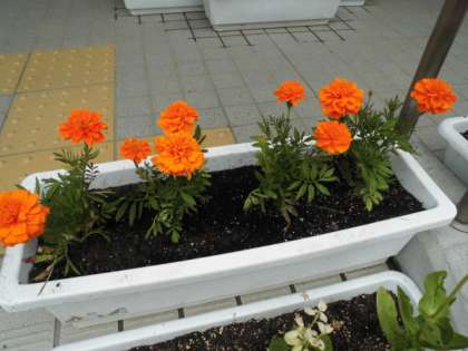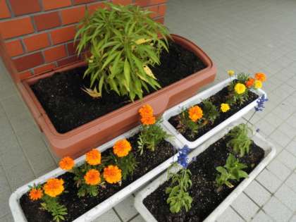 玄関にマリーゴールド、ホウセンカなど夏の花のプランターを置きました。