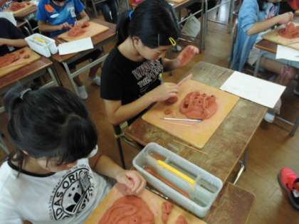 子どもたちは、心を集中し、へらを巧みに使って、オリジナルな面シーサーを創っていました。