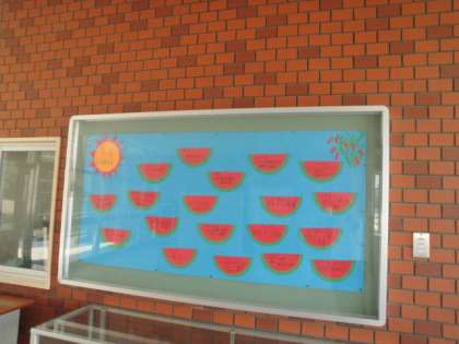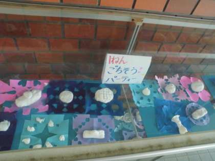 玄関の月予定の掲示とショーケースの作品が替わりました。