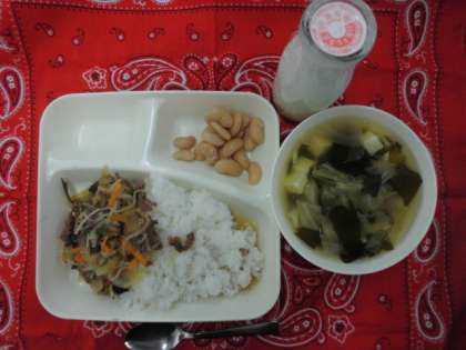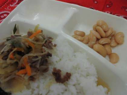 7月最初の献立は、牛丼、すまし汁、大福豆の煮物、牛乳でした。