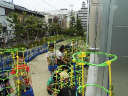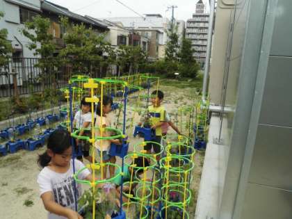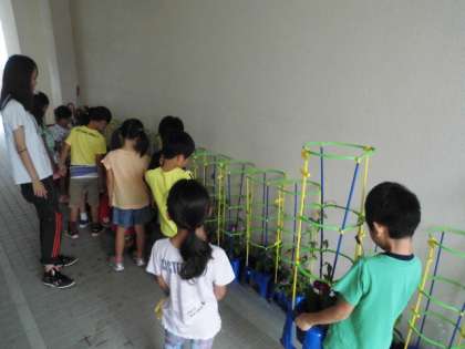 台風の接近が予想されるので、アサガオを校舎内廊下に避難させました。