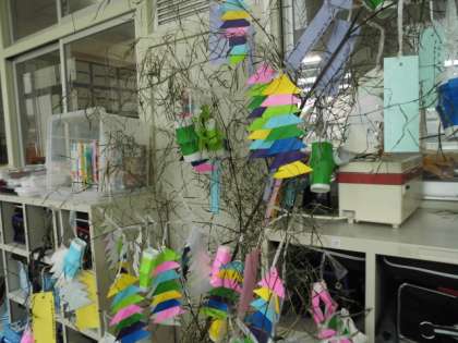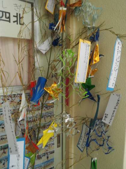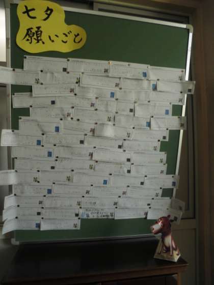 学級・学年の笹にも願い事がありましたが、校長室前の願い事掲示板の願い事がどんどん増えています。
