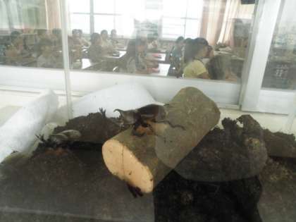 学校で飼育している(2年生)カブトムシはまだ成虫になっていませんが、6年担任の下川路先生の家のカブトムシが見事な成虫になったということで、教室に持って来られました。