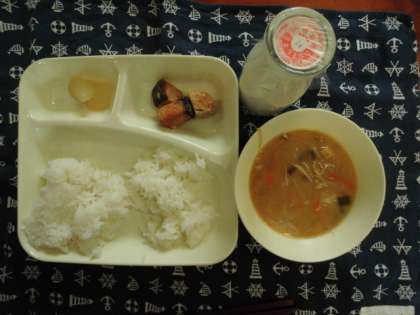 献立は、さけのさんしょう風味焼き、みそ汁、とうがんの煮物、ごはん、牛乳でした。
