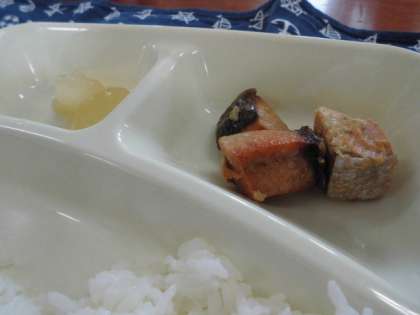 さけのさんしょう風味焼きは、焼いたさけに砂糖、みりん、こい口しょうゆ、さんしょうを合わせて煮ています。さけの味が深まるとともにさんしょうの風味がよくきいて、ごはんのよいおともと思いました。とてもおいしくごはんもすすみました。