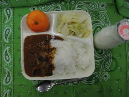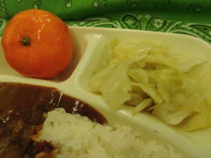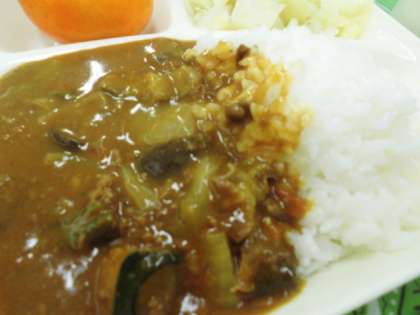 献立は、夏野菜のカレーライス、キャベツのサラダ、みかん(冷凍)、牛乳でした。
