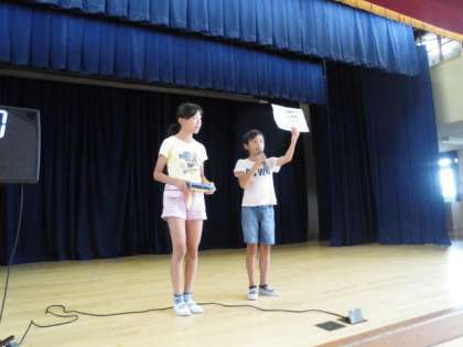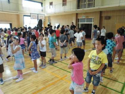 集会委員会からのイントロクイズの後、児童会から東桃谷小学校のゆるキャラコンテストのお知らせがありました。