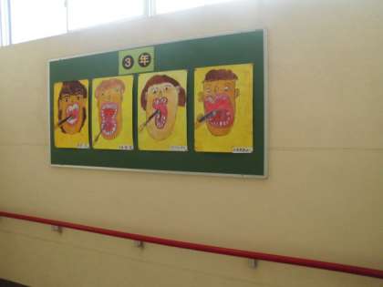写真は、1号階段(玄関から一番近い階段)の2階への踊り場にある掲示板に掲示されている3年生の図画作品です。歯磨きのポスターコンクールに応募する予定の作品です。