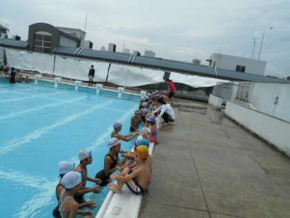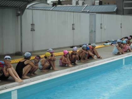 プールの水位を下げているので、入るときも一苦労。でも、5年生が先にプールに入って水をかけてあげたり、プールにおろしてあげたりしていました。