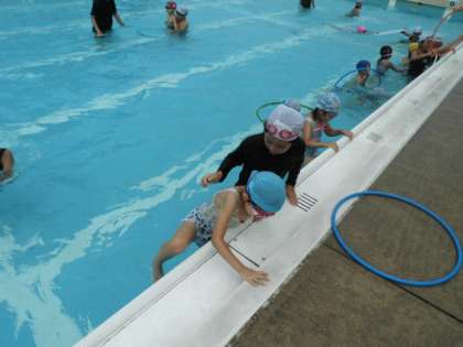 プールサイドに上がるときに園児が落ちないように気をつけている5年生はさすがでした。