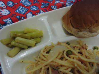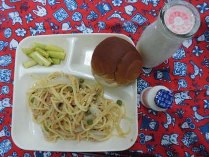 献立は、シーフードトマトスパゲッティ、グリーンアスパラガスのサラダ、発酵乳、パン、牛乳でした。
