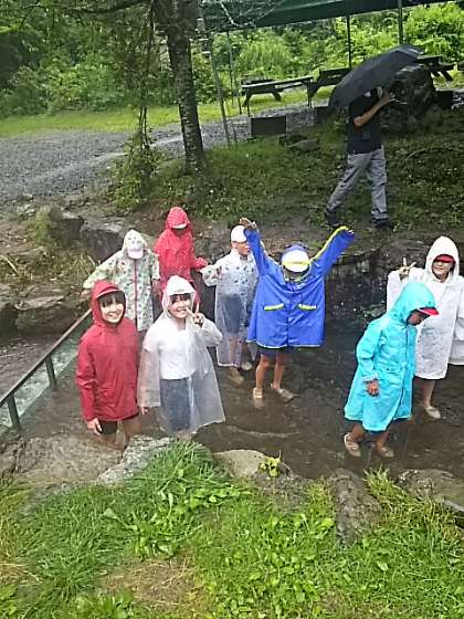 雨の中、希望者全員が川に入って魚つかみをし始めました。たくましい子どもたちです。