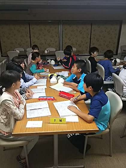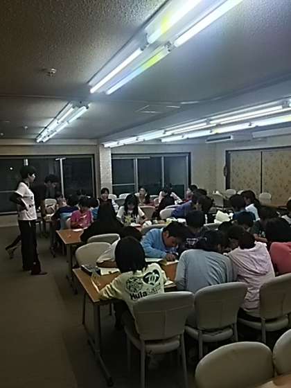 全体反省会を食堂でしています。