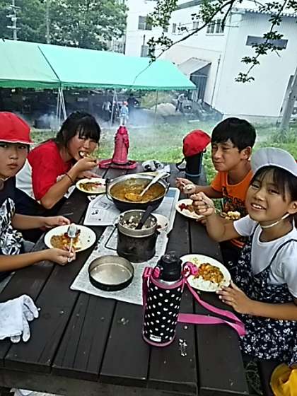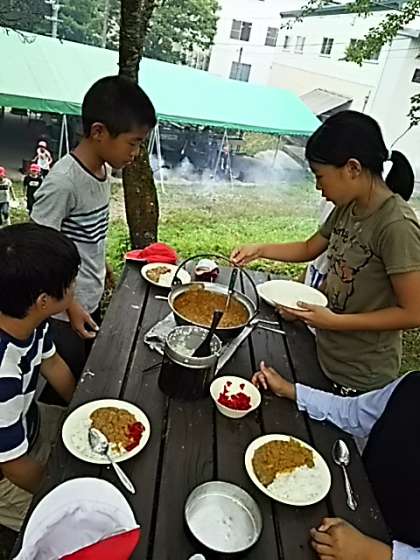 カレーもできあがりました。班ごとにいただきます。