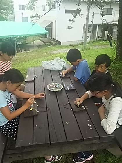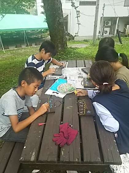 昨日磨いた焼き板に絵や言葉等を描いています。ハチ高原での林間の思い出を表現することができたらいいですね。
