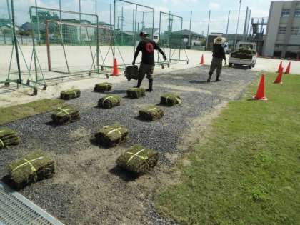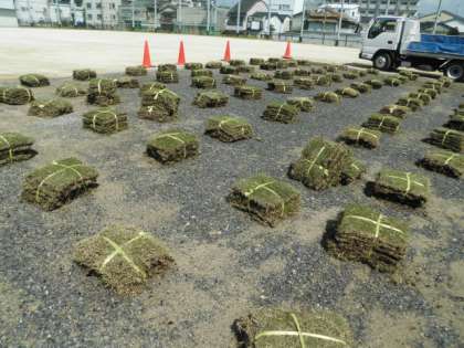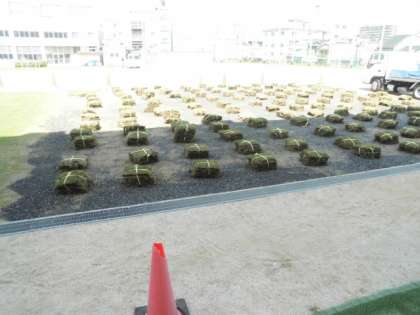 明日の芝張り作業に向けて、芝生が搬入されました。(約300枚)