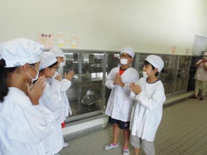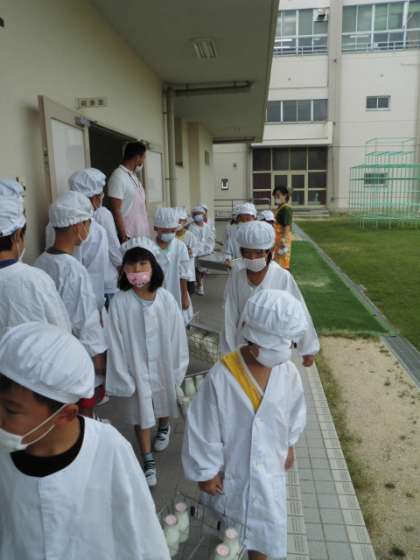 各学級ごとに給食当番の子どもたちがそろって給食室に食器やパン、牛乳、おかずを取りに来ました。