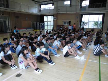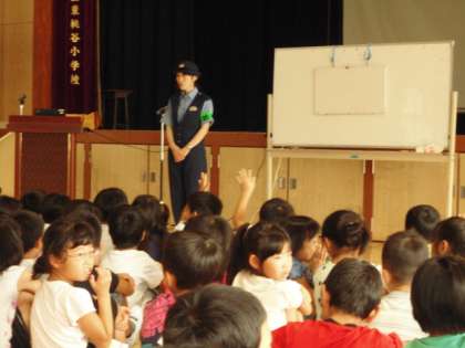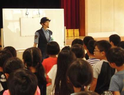 全学年児童が講堂に集まり、子どもの誘拐に気をつけることが主題の防犯教室です。