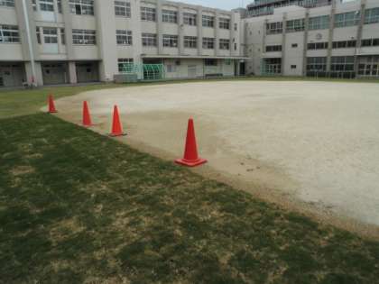 突然の雨でしたが、今、運動場で水が残っているのは、拡張した芝生境目の部分だけでした。