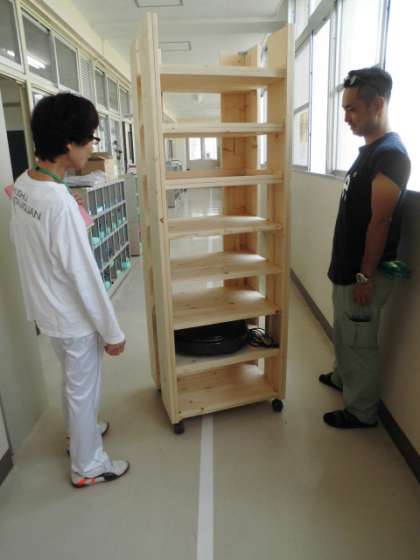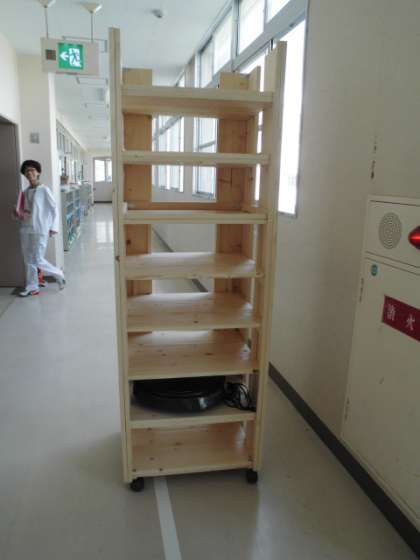 管理作業員自作のホットプレート置き台が完成し、家庭科室に運ぶところで出会いました。