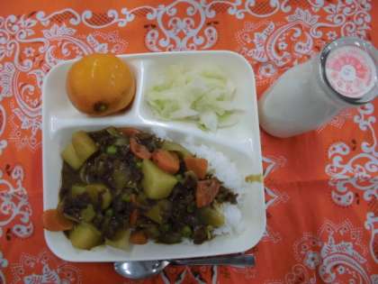ビーフカレーライスは、小麦アレルギー対応で米粉のルウを使って調理しています。とてもおいしくいただきました。カレーライスは、月に一回ですが、今月は、27日にドライカレーも予定されています。楽しみです。