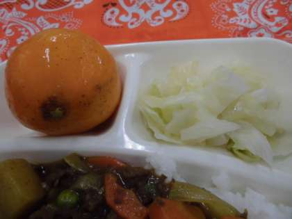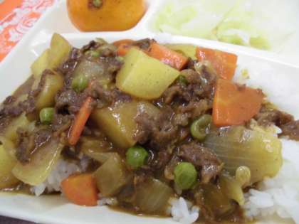 献立は、ビーフカレーライス(米粉)、キャベツのピクルス、みかん(冷凍)、牛乳でした。