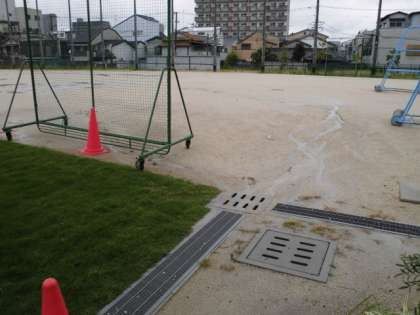 以前からの芝生もそうですが、拡張した芝生も雨は通しますが、土砂はとめています。