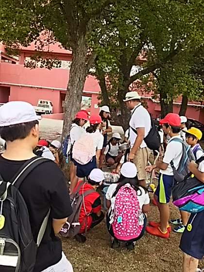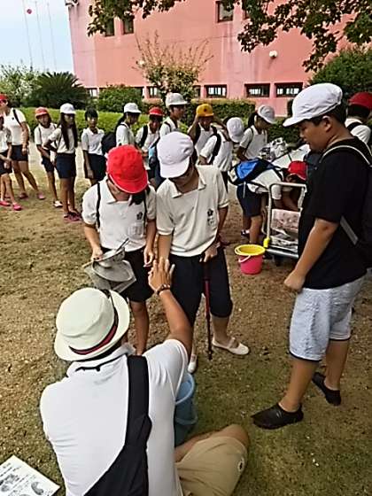 ストーンペイント活動です。説明を聞いた後、材料等を受け取っています。