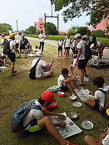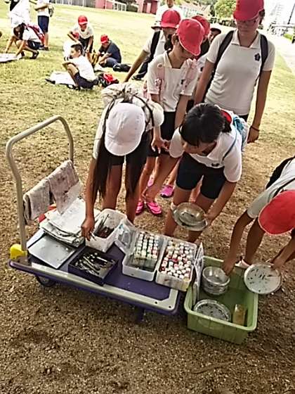 ストーンペイント活動です。説明を聞いた後、材料等を受け取っています。
