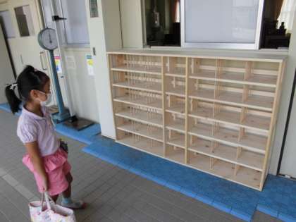 管理作業員手作りの保健室前くつ入れが完成しました。