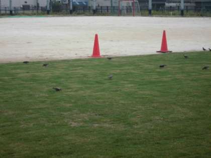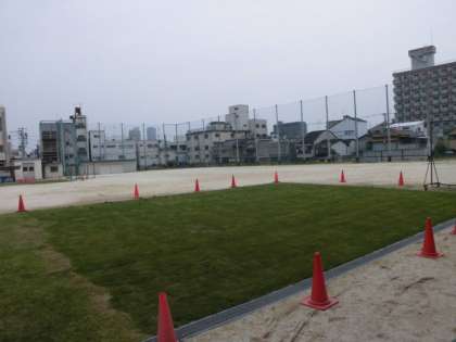 昨日、校長経営戦略支援予算(加算)で拡張した芝生の芝刈りを行いました。