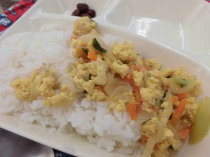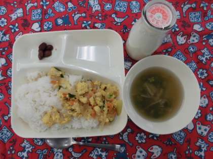 献立は、親子丼、とうがんのすまし汁、金時豆の煮物、牛乳でした。