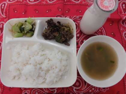 献立は、プルコギ、トック、チンゲンサイともやしの甘酢あえ、ごはん、牛乳でした。