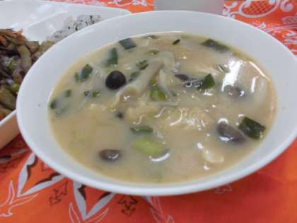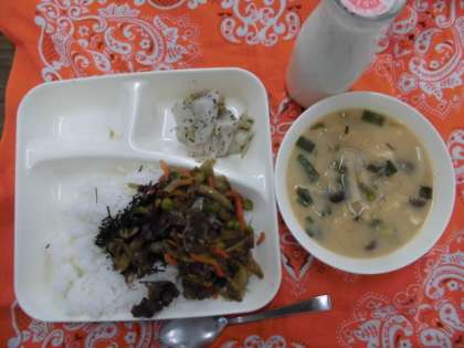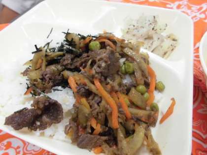 献立は、牛肉のきんぴらちらし、みそ汁、キャベツの赤じそあえ、牛乳でした。