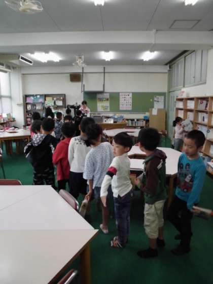 3時間目は、1年生が図書室へ本の返却・貸し出し、読書、読み聞かせで来ました。