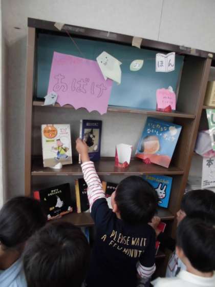 昌山先生が10月ということで、ハロウィンにちなんで集めた「おばけの本」のコーナーにも子どもは集まってきていました。