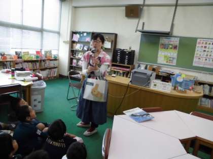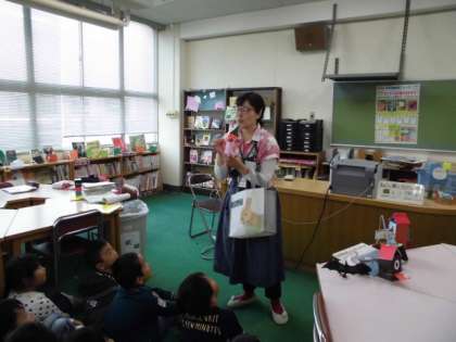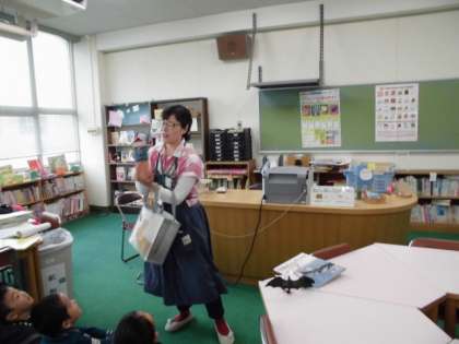 昌山先生から休み時間に遊べる、ハロウィンにちなんだ手作りのペープサートやおもちゃを次々に紹介されると子どもたちは、期待感がふくらんでわくわくしている様子でした。