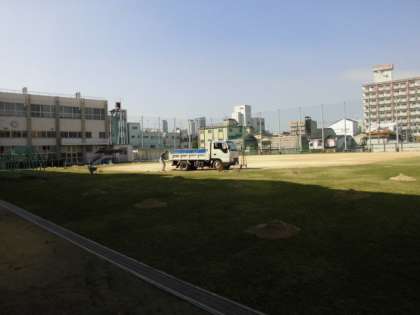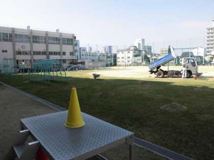朝礼台の上に置いた黄色のカラーコーンは、芝生は使えませんが運動場は使えるという合図です。10月28日まで芝生養生期間です。