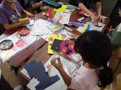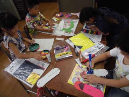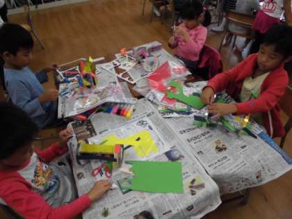 ころころ転がるように円筒形にしたものに絵を描いたり、色を塗ったり、色紙やテープを思い思いの形に切り取って貼ったりしています。