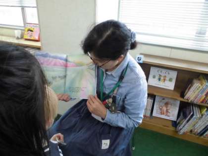 給食後の昼休みの時間に図書室へ行くと、子どもたちがすでに来ており図書館補助員の昌山さんの読み聞かせに夢中でした。