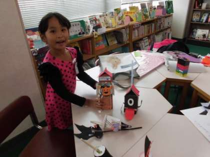 ハロウィンの手作りグッズのコーナーでは、いろいろと操作したりして楽しんでいました。