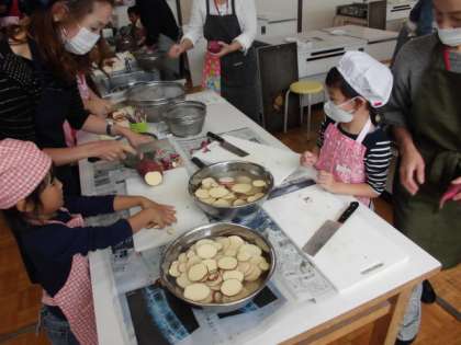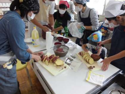 2年生のPTC集会「おいもパーティー」は、人形劇鑑賞後に家庭科室で行われました。